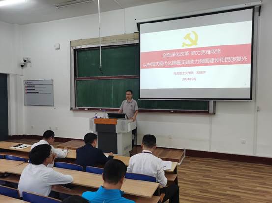 刘晓宇教授在讲座中为我院教职工全面剖析讲解了党的二十届三中全会精神,并结合学校和我院实际,对“一二三五十”发展战略和全面振兴新突破三年行动目标进行了深入的解读。