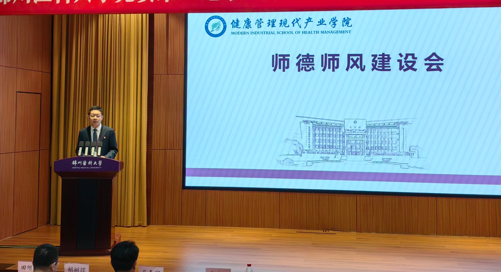 4月29日中午,健康管理现代产业学院在学校图书馆报告厅召开师德师风建设会。会议由党总支书记唐峭石主持。学院领导高度重视师德师风建设工作,会上,马春宇院长、胡树煜副院长和田继红副院长分别传达了师德师风建设相关文件精神和考核办法,最后唐峭石书记对全体教职工提出了三点要求: