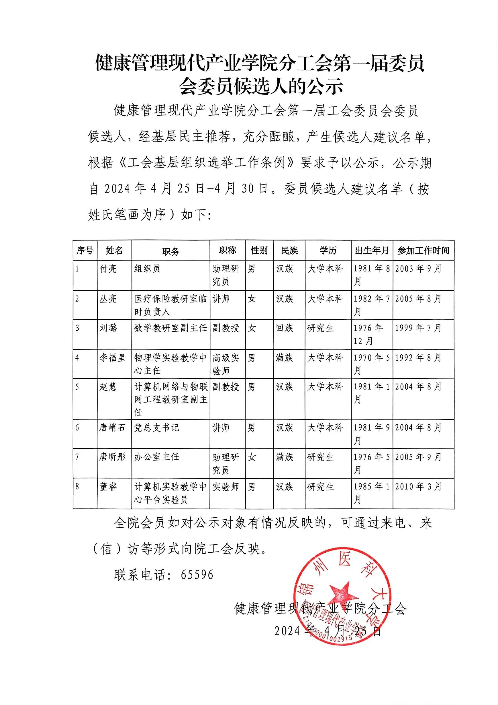学院分工会第一届委员会委员候选人的公示
