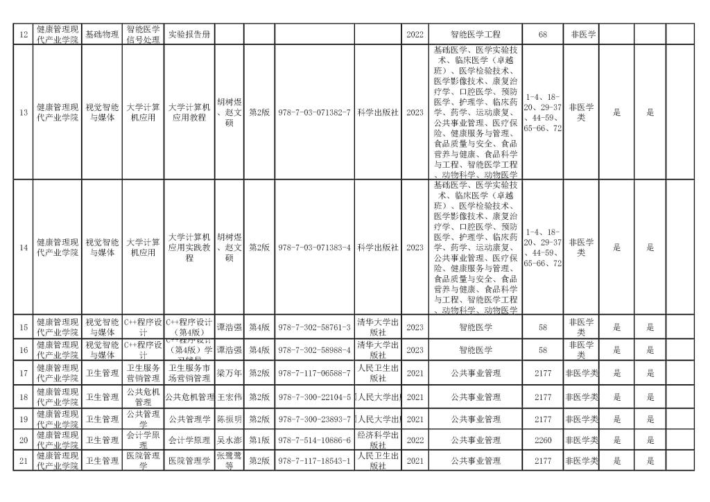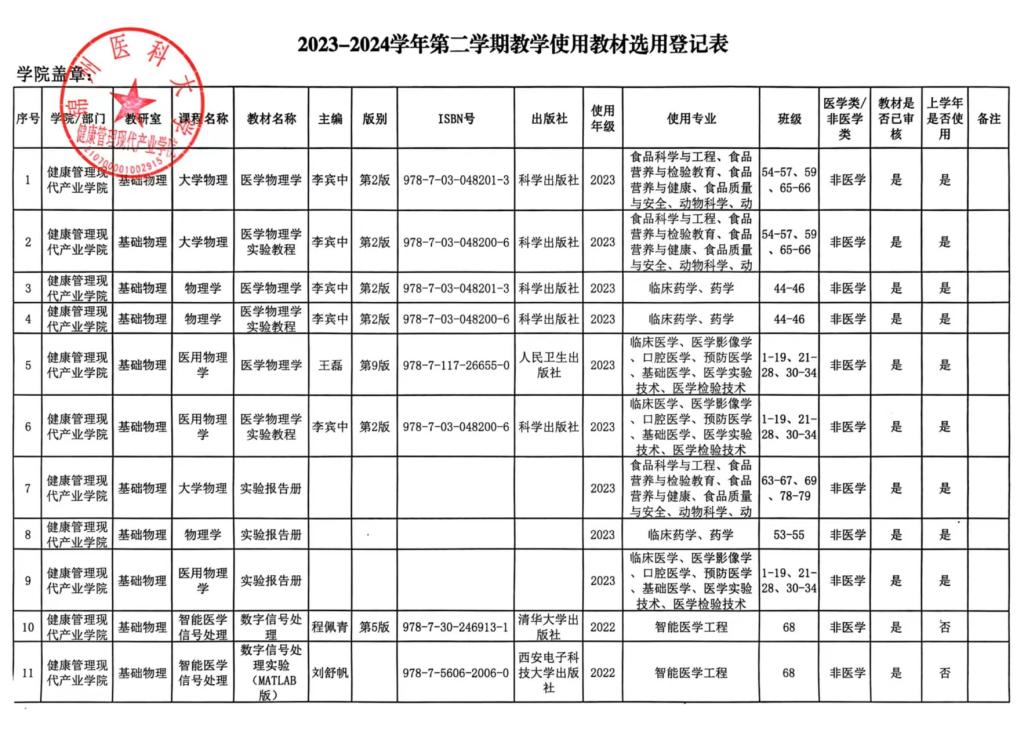 依据锦医大校字〔2022〕156 号《beat365中文官方网站教材管理办法(修订)》文件要求,健康管理现代产业学院现对《2023-2024学年第二学期教学使用教材选用登记表》进行公示,如有异议请于2024年1月1日16:00前以实名书面方式反馈至健康管理现代产业学院教务科,联系电话:62112、65711。